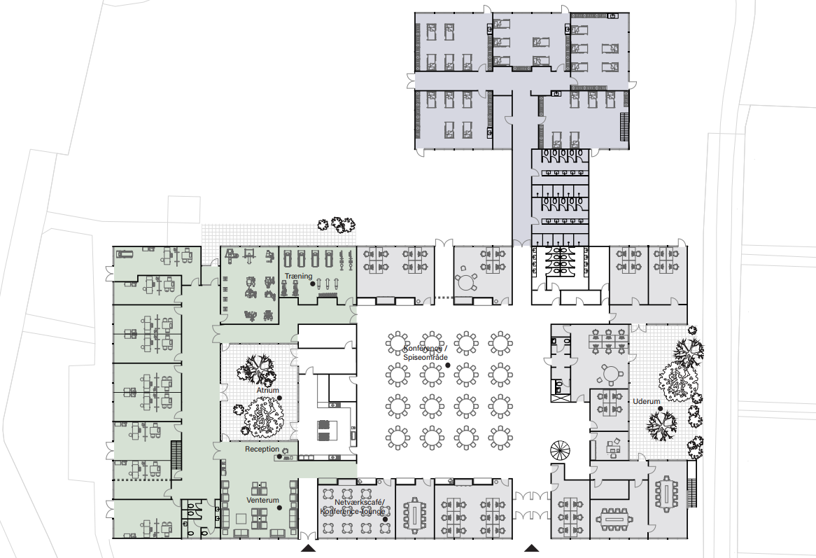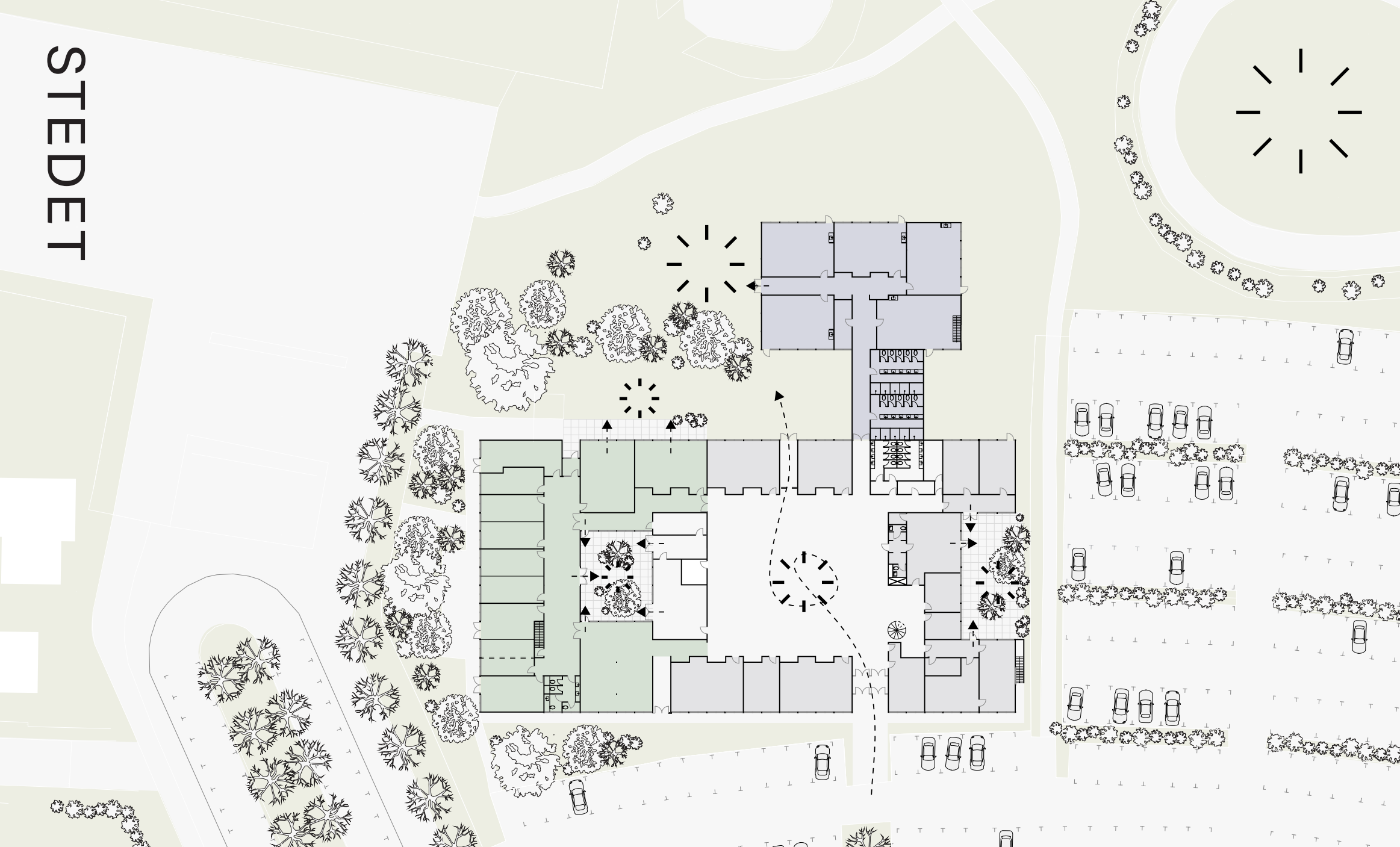 Hver zone åbnes udadtil mod omgivelserne og accentueres indadtil mod husets hjerte - den tidligere kantine og sal, der nu omdannes til cafe- og konferenceområde, med mulighed for afholdelse af større arangementer.